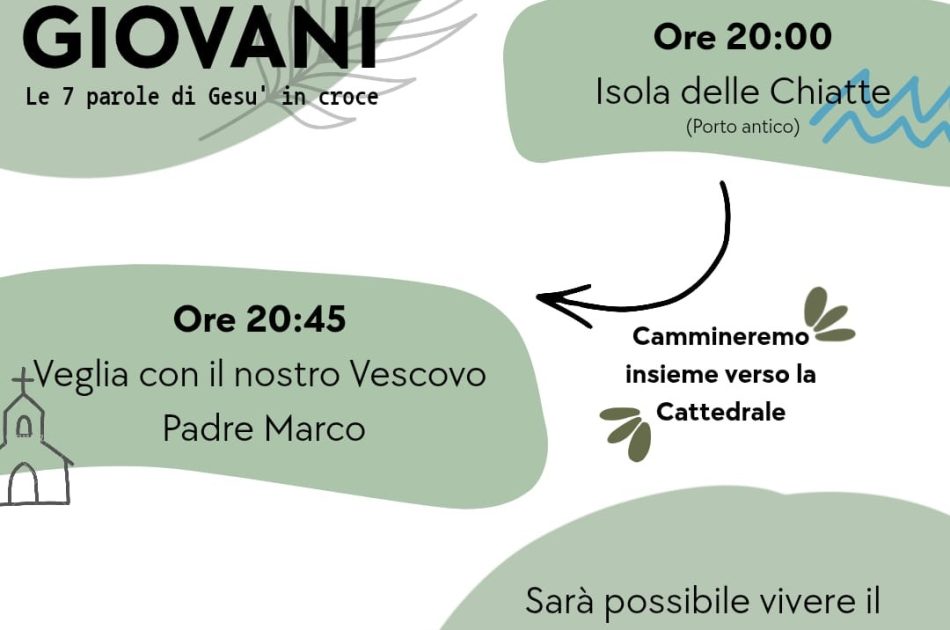 La Pastorale Giovanile invita i giovani a partecipare a “Pasqua Giovani”, un appuntamento di riflessione e spiritualità incentrato sul tema delle “7 parole di Gesù in croce”. L’evento, organizzato dalla Pastorale Giovanile, si terrà sabato 28 marzo dalle ore 20 con appuntamento al Porto Antico.